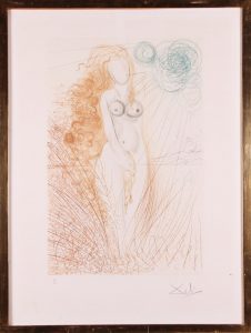 Gravure originale en couleurs, 58 x 39. Epreuve sur Rives 74 x 55 (au lieu de 80 x 58,5). Justifiée «55 / 150» et signée «Dali» au crayon en dessous. Pièce en belle condition. Sous verre, dans un cadre doré. (Albert Field, The Official Catalog of the graphic works of SalvadorDali, 1996, p. 66-67).