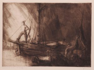 Eau-forte, 27 x 37. Signée «P. Daxhelet» en bas à droite. Titrée «Arrivée de bateau» et justifiée 1er état 1/3 en bas à gauche. Sous verre et passe-partout, cadre de bois ciré. En très belle condition.