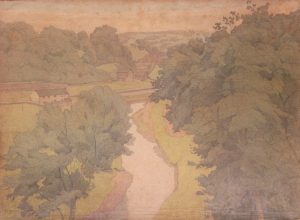 Dessin aux crayons de couleurs sur papier collé sur panneau, 57 x 78. Signé «Ph. Derchain» en bas à gauche. Titré et contresigné au dos. Papier légèrement bruni. Peintre et surtout dessinateur de paysages intimistes, portraits, intérieurs, etc. Cet autodidacte est un des principaux peintres intimistes verviétois (Arto).