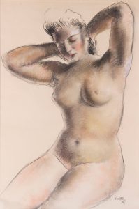 Dessin au fusain et crayons pastels, 70 x 47. Signé et daté «Dupagne. 1943» en bas à droite. Pièce en belle condition. Sous verre et passe-partout de jute, dans un cadre marron et doré. Peintre, aquarelliste et dessinateur né à Liège en 1889 et mort en 1980. Il voyagea beaucoup, tout en restant fixé à Liège (Arto).