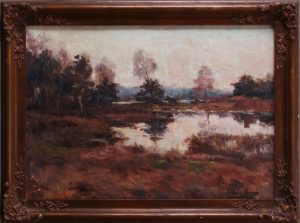 Huile sur toile, 40 x 50. Signée «Léon Jamin» en bas à droite. Dans un cadre orné vieux bronze. Peintre post-impressionniste de paysages de la Campine et des Ardennes, né à Liège en 1872 et mort en 1944 (Arto).