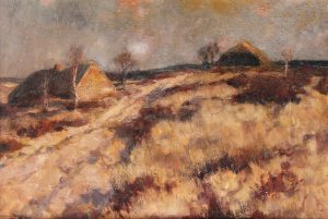 Huile sur toile, 60 x 80. Signée «Ludovic Janssen» en bas à gauche. Titrée «Soleil en Campine. Lommel» et contresignée «Ludovic Janssen. Rue des Eglantiers; Liège» au dos. Dans un cadre doré.