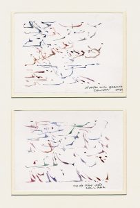 Suite de deux aquarelles, sur papier 13,5 x 18,8, titrées, signées au crayon, et montées sous un passe-partout unique, dans un cadre blanc (43,5 x 33,5). En très belle condition. Peintre et dessinateur, musicien, ami de Dotremont, né à Mons en 1930 (Arto).