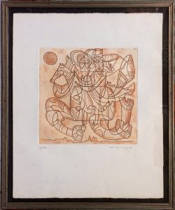Eau-forte en couleurs, 60 x 39. Epreuve sur vélin 70 x 50. Justifiée «76 / 80» et signée et datée «A. Longoni. 71» au crayon en bas dans la marge. En très belle condition. Sous verre et passe-partout, cadre vieil argent. Joint : A. LONGONI. Sans titre. 1972. Eau-forte en couleurs, 31 x 33 Epreuve sur vélin 60 x 50. Justifiée «17 / 50» et signée et datée «A. Longoni. 72» au crayon en bas dans la marge. En très belle condition. Sous verre et passe-partout, cadre vieil argent.