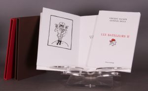 Editions Tandem, 2005, 2008. 2 vol. in-8 (28,5 x 19), en feuilles sous couverture d’éditeur, étui. Textes inédits de Vincent Pachès, gravures conçues et rehaussées par Antonio Segui. Un des trente exemplaires sur papier BFK de Rives numérotés et signés par les auteurs. Plusieurs illustrations de l’ouvrage sont aquarellées. En très belle condition.