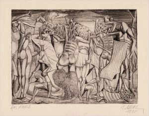 Burin, 18,5 x 24,5. Epreuve d’artiste sur papier vergé fin 31 x 34,5. Datée «1938» et signée «r. Ubac» au crayon en dessous. Très rare estampe, l’une des toutes premières de l’artiste. A l’époque, Ubac fréquente les surréalistes et participe à leurs activités (1934 - 1939), notamment avec des collages et des photographies, publiées entre autres dans la revue Minotaure. Sous passe-partout. Faible trace rose sur l’estampe et dans la marge inférieure, sinon en très belle condition.