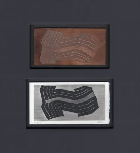 Cuivre original, 9,5 x 19, barré. Accompagné d’un tirage original,de l’eau-forte correspondante, justifié 133/150 et signé «r. Ubac» au crayon en dessous. Les deux pièces, sous verre et cadre en bois peint en noir. En belle condition.