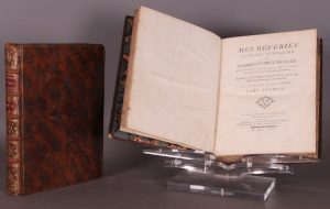 Amsterdam et Leipzig, chez Arkstée et Merkus, Paris, Desaint et Saillant, Durand, 1757 (imprimé en France et publié sous une fausse adresse). 2 vol. in-4 (29 x 22), plein veau fauve de l’époque, dos à 5 nerfs, compartiments décorés, pièces de titre maroquin bordeaux, tranches jaspées, faux-titre, page de titre, (6) p. (Avertissement, Avis au relieur)-cxxxiv (Vie abrégée…)-159 p., et faux-titre, titre, 259 p. Ouvrage illustré de 58 et 26, soit un total de 84 planches hors texte, dont 6 dépliantes. Première édition in-4 (l’originale parut en 1756, in-folio et in-8). Première édition strictement conforme au manuscrit original du Maréchal de Saxe. Il s’agit de la meilleure édition et la plus complète; elle comporte une remarquable illustration, bien complète. Ex-libris moderne. Petites usures à la reliure (premier mors du premier tome fragilisé dans le haut, etc). Intérieur en bonne condition générale.