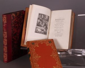 Londres [Paris, Cazin], 1780.Petit in-8 (18,7 x 11,5), plein maroquin orange pastiche, dos à 5 nerfs, compartiments ornés, pièces de titre maroquin vert foncé, large décor d’encadrement aux plats avec petites pièces mosaïquées en maroquin noir aux angles, double filet doré aux coupes, chasses décorées, tranches dorées. Illustré de 58 gravures hors texte, de 21 vignettes de titre, et de 6 portraits de Voltaire et Jeanne d’Arc. Ex-libris gravé E. Délicourt. Bel exemplaire en reliure pastiche de très grande qualité, intérieur de grande fraîcheur. Joint : [RECUEIL de GRAVURES]. Recueil de 70 gravures illustrant «La Pucelle d’Orléans» et autres œuvres. Gravures sur Chine collé, 12,5 x 8, sur des feuillets 21 x 14, dans un vol. in-8 (21,5 x 14,5), demi-maroquin et coins garance moderne, dos à 5 nerfs, compartiments décorés. Bel exemplaire à l’intérieur très frais.