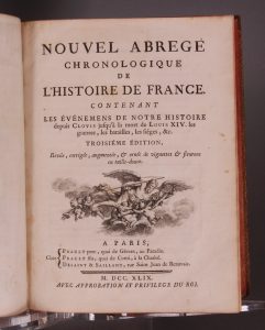 Suite du texte : Nouvel abrégé chronologique de l’histoire de France, contenant les événements de notre histoire depuis Clovis jusqu’à la mort de Louis XIV, les guerres, les batailles, les siéges, etc. Troisième édition, revûe, corrigée, augmentée, et ornée de vignettes et fleurons en taille-douce. Paris, Prault père, Prault fils, Desaint et Saillant, 1739. Grand in-8 (26 x 19,5), plein veau fauve de l’époque, dos à 5 nerfs, compartiments ornés, pièce de titre maroquin bordeaux, tranches rouges, faux-titre, titre gravé par B. Lépicié (Recueil des portraits…1738), page de titre (Nouvel abrégé…1739)-viii (avertissement)-636 p.-(56) p. (table, errata, privilège du roi). Illustré de 53 portraits de rois gravés hors texte, de bandeaux et gravures. Sauf de lég. usures aux bords de la reliure et coiffe supérieure frottée, bon exemplaire. Intérieur très frais.