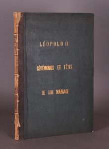 Bruxelles, Jules Géruzet, Editeur, 1853.Grand in-folio (52 x 35,5), demi-basane vert foncé, dos à 5 nerfs, plats de toile vert foncé, titré «Léopold II. Cérémonies et fêtes de son mariage» doré au premier faux-titre, 4 planches (Léopold Ier en pied, d’après Winterhalter; les époux, en lithographies en couleurs; leurs armoiries en chromolithographie)-page de titre-30 p.-2 planches hors texte sur la cérémonie-15 grandes planches en couleurs représentant les chars du cortège. Le dos de la reliure frotté; rousseurs pâles au portrait de Léopold Ier; déchirure sans perte à la dernière lithographie en couleurs; rousseurs pâles sporadiques par endroits.