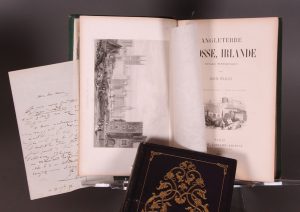 Paris, Morizot, Libraire-Editeur, 1859.Grand in-8 (27 x 17), en cartonnage vert de l’époque, dos à 5 nerfs, tranches dorées, garde de soie moirée (oxydées), 532 p. Illustré de 4 types en couleurs de Gavarni, et de 15 vues gravées d’après Allom et autres. Enrichi d’une lettre autographe de Louis Enault, du 30 septembre 1858. Reliure légèrement frottée, intérieur frais. Joint : Paris-Londres. Keepsake français 1838. Nouvelles inédites illustrées par vingt-six vignettes gravées à Londres par les meilleurs artistes. Paris, Delloye, Desmé et Cie, et aussi à la Librairie Delloye, 1838. In-8 (23,5 x 15,5), plein chagrin noir de l’époque, plats et dos ornés de filets et plaques romantiques, tranches dorées, 236 p. Illustré de 26 planches sous serpente. Gardes intérieures lég. oxydées, sinon bel exemplaire.