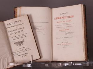 Paris, chez Barraud, Editeur, 1876 (réédition des éditions de 1617 et suivantes). In-8 (20,5 x 13,5), demi-veau brun de l’époque, dos à 5 nerfs, titre et fleurons dorés, xi-271 p. Ouvrage satirique. Abondamment illustré, dont des planches hors texte. Ex-libris moderne. Bel exemplaire. Joint : La Femme comme on n’en connoit point, ou la primauté de la femme sur l’homme. Londres, chez Gabriel Goldt, au Phoenix, et chez les meilleurs Libraires de l’Europe, 1786.Petit in-8 (17 x 10), demi-veau de l’époque, tranches jaspées, 165 p. Bel exemplaire.