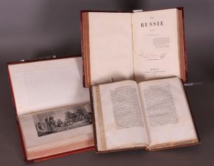 Grand in-8 (24 x 15,5), demi-chagrin à petits coins grenat, dos à 4 nerfs ornés, 402 p. Illustré. Cachet. Petites usures à la reliure. Rousseurs pâles cantonnées aux premiers et derniers feuillets. Joint : [Aux armes de France]. PERTSIER (Charles). Promenades pittoresques dans Constantinople et sur les rives du Bosphore […] Tome second seul. Paris, Nicolle, 1815. In-8 (21 x 13), plein veau raciné de l’époque, dos lisse orné, pièces de titre maroquin rouge, les armes de France aux centres des plats. Bel exemplaire. Joint : CUSTINE (Marquis de). La Russie en 1839. Bruxelles, Wouters et Cie, Imprimeurs-Libraires, 1843. 4 parties en un vol. in-8 (22,5 x 14), demi-chagrin et coins grenat, dos à 4 nerfs ornés. Bon exemplaire.