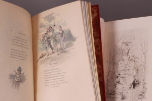 Paris, Librairie Ancienne et Moderne Edouard Rouveyre, 1881.In-8 (21 x 13,5), demi-chagrin et coins vert, dos à 5 nerfs, tête dorée, les plats de la couverture (illustrée par Paul Avril) conservés, 187 p. Frontispice gravé par Géry-Bichard. Bel exemplaire sur Hollande. Joint : [MORIN]. VAUCAIRE (Maurice). Vingt masques. Dessins de Louis Morin. Paris, Librairie A. Rouquette, s. d. (1895). In-8 (21,3 x 13,5), demi-maroquin et coins orange, dos à 5 nerfs, titre et tête dorés, les plats illustrés par Morin et le dos de la couverture conservés (reliure signée E. Maylander), 40 p. Un des 100 exemplaires numérotés impérial du Japon de l’édition originale (seul grand papier), avec une suite sur Chine des illustrations de Louis Morin. Bel exemplaire très frais.