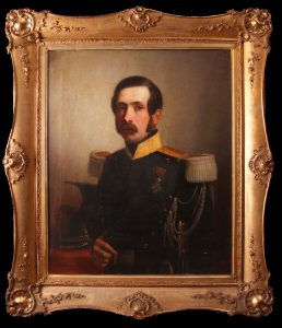 Huile sur toile, 83 x 68. Signée et datée «Vr Delacroix, 1846» en bas à droite. En belle condition, dans un cadre orné doré. Frédéric Charles François de Villiers, né le 25 mars 1810 et mort le 11 décembre 1902, fut lieutenant général dans l’armée belge et aide de camp de Léopold Ier. En 1846, il était major au 2ème régiment de Lanciers. Le peintre néo-classique Victor Delacroix naquit à Paris en 1802 et mourut à Roubaix en 1868. Français, il obtint la naturalisation belge. Il fut élève à l’Académie de Bruxelles en 1829-1830, ainsi que du peintre Joseph Odevaere (Arto).