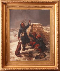 Huile sur panneau de bois, 46 x 59. Signée «A. Gienty» en bas à gauche. Pièce en belle condition. Dans un cadre orné doré. Un zouave brandit un rat mort devant deux camarades et un chien affamé… Cette scène est située durant le siège de Sébastopol (1854).