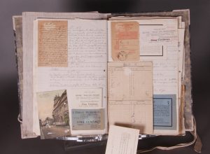 2 forts cahiers 35 x 21,5, coportant des annexes collées (affichettes, cartes postales, brochures, tickets, etc.) L’auteur était greffier à la justice de paix de Seraing. Ecriture très lisible. En belle condition. Intéressante contribution à l’histoire locale et à l’étude de la vie quotidienne durant la Première Guerre Mondiale.
