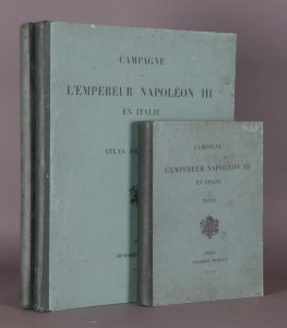 Paris, Imprimerie Impériale, 1862.Texte : In-folio (37,8 x 28, demi-toile muette d’origine, plats recouverts de papier vert pâle, le premier portant le titre imprimé (plats très lég. sali), 385 p, tableaux à déplier. Sauf de rares rousseurs pâles, intérieur très frais. 2 atlas : Atlas des marches / Atlas des batailles, 2 vol. in plano (56 x 44), mêmes éditeur, année, reliure et état que le vol. de texte, ils contiennent chacun une page de titre lithographiée et un tableau des signes conventionnels, ainsi que 59 cartes en couleurs pour les marches, et 24 planches en couleurs pour les batailles (ainsi que la table des cartes de batailles au début). Les deux dernières cartes se sont décollées de leurs onglets, sans dégâts. Bel exemplaire des trois volumes.