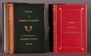 Bruxelles, Goemaere, Imprimeur du Roi, (1933).In-8 (25 x 16,5), plein maroquin vert foncé, titre doré au dos, et au premier plat, tête dorée, filet doré aux coupes, chasses décorées, les plats de la couverture conservés, étui, 398 p. Exemplaire de présent offert par la fraternelle des anciens combattants carabiniers et diables noirs de Verviers et environs à sa présidente d’honneur en 1937. Illustré. Sauf le dos insolé, bel exemplaire. Joint : [RELIURE de PRESENT]. LIBRECHT (Major d’état-major) et lieutenant adjoint d’état-major CABRA. Attaque et défense des places. Bruxelles, Imprimerie Gustave Deprez, Editeur, 1895. Plein maroquin vermillon; dos à 5 nerfs, compartiments ornés de lions dorés, triple et double encadrements de filets dorés avec lions d’angles, et hommage «A monsieur le général chevalier Marchal» au premier plat, filet aux coupes, chasses décorées, gardes de soie moirée rouge, tranches dorées, 166 p., une carte à déplier (étui de carton). Exemplaire imprimé sur beau papier glacé, avec envoi : «A Monsieur le Général chevalier Marchal. Hommage très respectueux et très affectueux. G. Librecht. A. Cabra. Br. le 29 mai 1895». Sauf légère usure des mors et de la coiffe supérieure, bel exemplaire.