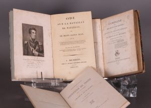 Paris, P. Mongie, Libraire, 1818. In-8 (20,5 x 13), demi-veau et coins blond (reliure frottée, mors abîmés). Relié à la suite : Genéral BERTON, Précis… des batailles de Fleurus et de Waterloo,…, Paris, 1818; Général GROUCHY, Observations sur la Relation de la campagne de 1815, publiée par le général Gourgaud, Paris, 1819 (avec carte). Joint : LE MAYEUR. Ode sur la bataille de Waterloo, ou de Mont-Saint-Jean... Bruxelles, P. J. De Mat, 1816. In-8 (18 x 13), cartonnage amateur moderne. Portrait du prince royal des Pays-Bas en frontispice. Relié à la suite : M. de ROCCA, Relation fidèle et détaillée de la dernière campagne de Buonaparte…Cinquième édition, suivie de La campagne de Walcheren et d’Anvers…, Bruxelles, P. J. De Mat, 1816, avec deux planches en couleurs (La ferme de la Belle Alliance, et carte du champ de bataille). Un volume frais. Joint : EENENS (A.) Dissertation sur la participation des Pays-Bas à la campagne de 1815 en Belgique. Gand, 1879. Petit in-8, reliure amateur.