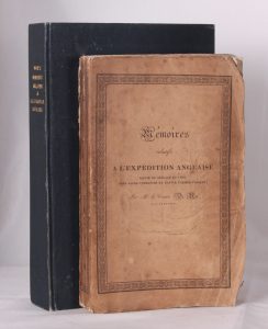 (Paris), Imprimé, par autorisation du roi, à l’Imprimerie Royale, 1826. In-8 (22 x 13,5), couverture d’éditeur, iii-288 p.-2 f. (errata et note pour le relieur). Illustré de 2 cartes en couleurs à déplier, et de 19 planches en couleurs hors texte. Ex-libris gravé armorié anglais Ackworth. Emboîtage moderne de tissu noir avec titre doré. Exemplaire racheté par l’auteur à Paris en 1845 et offert par l’auteur à Mr Ackworth 16 mars 1848 (ex-dono signé au faux-titre). Rares mémoires d’un royaliste français qui accompagna l’armée anglaise et vit les derniers moments de l’Egypte occupée par les Français (Tulard, 1.094).