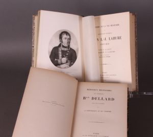 Paris; A. Lahure, Imprimeur-Editeur, 1895. In-8 (22,5 x 15), demi-toile verte, pièce de titre maroquin rouge, les plats de la couverture conservés, xxiv-350 p. Portrait en frontispice. (Tulard 818). Bel exemplaire. Joint : DELLARD (Jean-Pierre). Mémoires militaires du général baron Dellard sur les guerres de la République et de l’Empire. Paris, A la Librairie Illustrée, 1892. In-8 (22,5 x 14), demi-toile verte, titre doré. (Tulard, 414). Sans le portrait annoncé. Frais.
