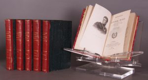 Paris, chez Ladvocat, Libraire, 1823.3 vol. 20 x 12, demi-toile rouge postérieure, filets et titre dorés au dos (pour le premier vol.), demi-maroquin rouge, filets et titre dorés au dos (pour les deux vol. suivants), 292, cii (Précis historique des événemens qui ont conduit Joseph Napoléon sur le trône d’Espagne, pour servir d’introduction à la deuxième partie des mémoires du général Hugo, par Abel Hugo [fils du général])-388 p., et 480 p. Portrait gravé du général Duroc en frontispice du premier volume. Mémoires du père de Victor Hugo (Tulard, 712). De la Collection des mémoires des maréchaux de France et des généraux français, publiée par Ladvocat. Premier mors et coiffe supérieure du deuxième vol. abîmés. Relié au début du premier tome : Général AUBERTIN, Mémoires (sur la Guerre de Vendée), 175 p. Joint : Trois ouvrages de la même collection, de 1824, dans la même reliure que le dernier ci-dessus. Olivier d’ARGENS. Mémoires et correspondance des généraux vendéens; Général CUSTINE. Mémoires sur les guerres de la République, précédés d’une notice sur le général Dumouriez; Maréchal de ROCHAMBEAU. Mémoires sur les guerres de la Révolution. Ensemble en belle condition.