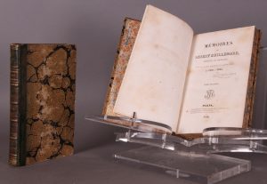 Paris, Delaforest, Bossange et Baudouin, 1826.2 vol. in-8 (21 x 13), demi-veau de l’époque, dos à 5 nerfs orné, tranches cailloutées, iv-376 et 360 p. (Tulard, 671). Sauf la coiffe inférieure du second volume émoussée, bel exemplaire de ces rares mémoires sans doute basés sur les papiers d’un personnage ayant existé (catalogue bibliothèque d’Huart, librairie Teissèdre).