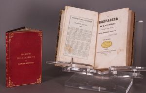 Liège, Ch. Aug. Desoer, Imprimeur-Libraire, 1886.In-8 (17,5 x 11,5), plein maroquin rouge de l’époque, filet et fleurons au dos, filet d’encadrement aux plats, et titre au centre du premier, tranches dorées, 126 p. Dans une reliure de présent, rare récit d’un prisonnier des pontons anglais, né en 1784 et mort après 1843. (Tulard, 109). Joint : BARGINET (Alex. P.) Le Grenadier de l’Ile d’Elbe. Souvenirs de 1814 et 1815. Paris, Mame et Delaunay-Vallée, Libraires, 1830. 1 vol. in-8 (sur 2), demi-veau de l’époque. Pseudo-souvenirs (Tulard, 79).
