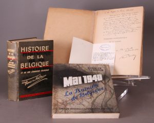 Genève, Kundig, Paris, Rousseau et Cie, 1916.In-8, broché, non coupé. Long envoi manuscrit de l’auteur à la Reine Elisabeth. Carte tapuscrite du château de Laeken. Dos renforcé. Joint : KALKEN (Frans van). Histoire de la Belgique et de son expansion coloniale. Bruxelles, Office de Publicité, 1954. In-8 cartonné (mors fr.). Carte tapuscrite du Palais de Bruxelles. On joint la lettre d’hommage à la Reine, et une lettre du Grand maître de la maison de la Reine. Joint : [BIBLIOTHEQUE du PRINCE CHARLES]. FOUILLIEN et BOUHON. Mai 1940. La Bataille de Belgique. Bruxelles, L’Edition Universelle, s. d. In-8 broché. Jaquette. Illustré. Un des 20 exemplaires sur beau papier de l’édition originale (n° 2). Bon exemplaire. Carte tapuscrite du Palais de Bruxelles.