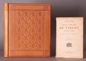 Leipzig et Bruxelles, Breitkopf et Hærtel, s. d. (la collection de 49 vol. qui fut éditée de 1884 à 1936). Exemplaire de présent destiné au Roi Albert Ier et à la Reine Elisabeth (in-folio, plein veau blond, tranches dorées). Légères traces d’humidité à la reliure. Enrichi d’une lettre de Félicien Durand au baron Buffin, destinée à inciter la Reine à se rendre à une des répétitions des Concerts Durant; invitation à Madame Lejeune à un défilé. Joint : LAURENCIE (Lionel de la). L’Ecole française de violon de Lully à Viotti. Tome premier seul. Paris, Delagrave, 1922. In-8, broché. Illustré de notations musicales. Carte tapuscrite du Palais de Bruxelles.
