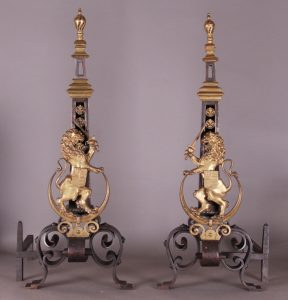 Bronze et fer forgé. Hauteur : 87 cm. Largeur : 33 cm. Décor : le lion belge brandissant un sabre et portant un bouclier aux armes de la province de Liège (hauteur : 34 cm). Bien complets de leurs consoles de fer forgé (profondeur : 50 cm). La forme générale des chenets rappelle celle du Perron liégeois. Provenance : la société de fabrication d’armes liégeois Ancion-Marx; il s’agirait d’une pièce de commande qui, selon la tradition, aurait été offerte à l’Union des Fabricants d’Armes de Liège, et daterait environ de 1890-1895. Marque SP dans un cercle sous la base de l’un d’eux. Ensemble en belle condition.