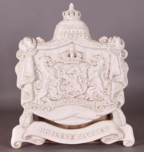 Ancienne enseigne en fonte émaillée, blanche, avec les armoiries et la devise «Je maintiendrai», et «Hofleverancier» (fournisseur de la cour). L’objet semble dater de plusieurs dizaines d’années.