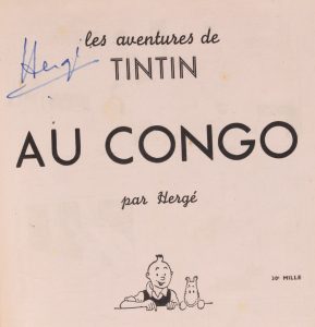 Casterman, 1942.Edition noir et blanc, dos rouge, 4ème plat A18, Pages de garde bleu foncé. Tirage à 5.000 exemplaires. 4 hors-textes en couleurs. Signature d’Hergé sur la page de titre. Plusieurs déchirures, traces d’autocollant, plusieurs taches à des marges et aux planches. Traces de crayon rose et une petite tache d’encre au 1er plat. Crayon gris à la bouche de Tintin de la p. 2 à la p. 6, sporadique par la suite. Usures aux plats et aux bords. Manque au bas du dos, mors fragilisés.