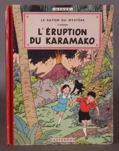 Casterman, 1951.Edition originale, dos rouge, 4ème plat B5. Usures aux plats, aux coins et au dos. Quelques rousseurs dans les marges, sinon en bonne condition. Joint : HERGE. Les Aventures de Jo, Zette et Jocko. Le Stratonef H. 22. 2ème épisode. Destination New-York. Casterman, 1951. Edition originale, dos rouge, 4ème plat B5. Usures au dos et aux coins, annotation en page de garde, sinon bonne condition. Joint : HERGE. Les Aventures de Jo, Zette et Jocko. Le Rayon du mystère. 2ème épisode. L’Eruption du Karamako. Casterman, 1952. Edition originale, dos rouge, 4ème plat B6. Usures au dos et aux coins, petit manque de carton au 4ème plat, annotation en page de garde, sinon bonne condition.