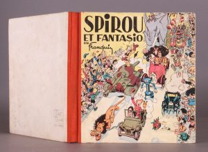 Edition J. Dupuis, 1948.Edition originale. Album carré (22 x 24), dos toile orange. 1er plat : Fantasio et son tank, les maisons préfabriquées, l’héritage de Spirou, le savant fou. Quelques taches à des marges, cahiers lég. relâchés. 3 cachets d’une cordonnerie aux pages de garde. Quelques taches aux plats, usures aux bords. En bon état d’ensemble.