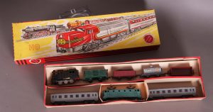 Un train électrique Distler, composé d’une locomotive, de 3 wagons et d’un wagonnet à charbon. Circuit complet. Boîte abîmée, papier collant aux coins. En bon état. Joint : Un train électrique composé d’une locomotive et de 7 wagons. Boîte abîmée, train en bon état.