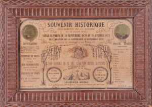 «Reliquaire» autour d’un morceau de pain de l’époque, sur une gravure (14 x 22,5) reprenant les privations et les événements de la Commune (cherté des denrées, dates des batailles, capitulation, nombre de morts, etc.) illustrée. Editeur : 36, Rue aux Ours. E. S. Sous verre, dans un cadre de bois sculpté.