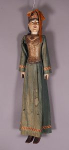 Bois sculpté peint, soie (très salie), tissu. Hauteur : 87 cm. Complète. Petites usures, sinon en bonne condition.