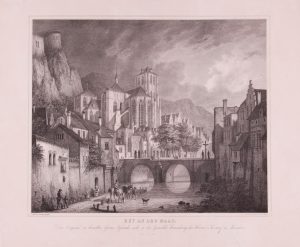 Lithographie sur vélin 52,5 x 61,5. Titrée en dessous avec «Das Original in derselben Grösse befindet sich in der Gemälde Sammlung des Herrn v. Kerstorf in München», avec «Gemalt von Dominicus Quaglio», «Auf Stein gezechnetvon A. Borum». Sauf une petite restauration au bord de la marge inférieure, en bonne condition. Peintre d’architecture, graveur et lithographe né à Munich en 1786 ou 1787 et mort à Hohenschwangen en 1837, il reproduisit notamment des vues et monuments des Pays-Bas, d’Allemagne, etc. La vue montre la citadelle, la collégiale et la Meuse à Huy.