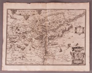 Carte en couleurs, 19,3 x 26,8. Namur et ses environs. Sous verre et passe-partout, cadre de bois ciré. Titre dans un cartouche surmonté des armoiries de la ville, le tout en bas à droite. Echelle en bas à gauche. Papier insolé, quelques rousseurs au passe-partout, sinon en belle condition. Joint : [NAMUR]. «Namurcum comitatus». 1579. Carte de Namur et de ses environs, 39 x 51. Titre dans un cartouche en haut à gauche, échelle en bas à gauche, une rose des vents au milieu à droite. Au verso, texte en latin titré «Namurcum». Papier insolé, traces de manipulations dans les marges.