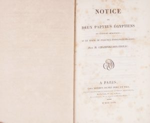 CHAMPOLLION-FIGEAC (Jacques-Joseph). Notice de deux papyrus égyptiens en écriture démotique, et du règne de Ptolémée-Épiphane-Euchariste. Paris, Dondey-Dupré père et fils, 1823. In-8, demi-basane beige à coins, dos lisse avec le titre en...
