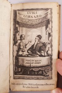 Luigi CORNARO. Discorsi della vita sobria. Paris, Pierre des Hayes, 1646. In-24 rel vélin de l’époque, dos lisse. 8 ff nch dont planche en taille douce - 123 pp. Ex-libris Pierre Daniel Huet, évêque de Soissons et Avranches.