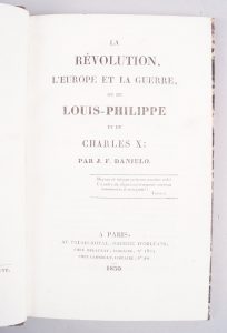 JF DANIELO. La Révolution, l’Europe et la guerre, ou de Louis-Philippe et de Charles X. Paris, Palais Royal, Delaunay et Ladvocat, 1830. In-8 demi-rel marron dos orné.