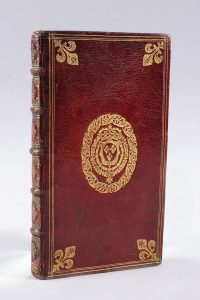 en vers et en prose, pour l’histoire du Roy, pour les revers de ses médailles, pour les monuments publics érigez à sa gloire, & pour les principales statuës du palais de Versailles. Paris, Jacques Morel et Henry Charpentier, 1686. In-8 maroquin rouge aux armes de France entourées des ordres de Saint Michel et du Saint Esprit et surmontées de la couronne fermée, trois filets d’encadrement sur les plats avec fleurons dans les angles, dos à nerfs orné avec fleurons, roulette sur les coupes, tranche dorée (reliure d’époque). Frontispice en taille douce figurant l’assemblée des dieux dans l’Olympe au-dessus du château de Versailles. 69 pages dont épître et sonnet (frontispice restauré). Suivi de : Inscriptions qui comprennent toute l’histoire de Louis le Grand, et qui peuvent servir à des revers de médailles : et à l’explication des principales actions de sa vie, et des plus beaux événements de son règne. 97 pages. Frontispice en taille douce d’après I. Sauvé figurant Apollon sur son char sous les traits du roi.