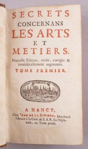 Jean de LA RIVIERE. Secrets concernans les arts et métiers. Nouvelle édition, revûë, corrigée & considérablement augmentée. 2 tomes. Nancy, Jean de la Rivière, 1721. In-8. Tome I : 26 ffnch - 540 pp. Tome II : 14 ffnch titre / préface /...