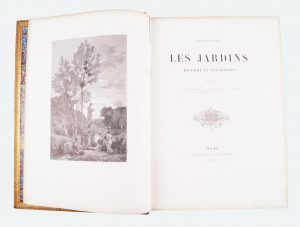 Arthur MANGIN. Les jardins, histoire et description. Tours, Mame et fils, 1867. Édition originale. In-folio chagrin rouge orné à la plaque, dos à faux nerfs, roulette intérieure.
