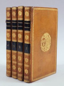 [Duchesse de Berrry]. Lady MORGAN. Florence Macarthy, histoire irlandaise. Paris, H. Nicolle, 1819. 4 vol in-12 veau havane, reliure aux armes de la duchesse de Berry, dos lisse orné avec pp titre tomaison mar noir, roulette d’encadrement sur les...