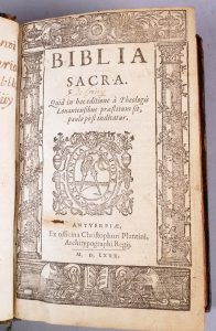[Religion]. Biblia Sacra. Anvers, Christophe Plantin, 1580. 8 ffnch dont titre-frontispice sur bois (petit manque) -799 pp - 20 ffnch (index testimoniorum / Hebraicorum chaldeorum , graecorumque nominum interpretatio). Reliure postérieure veau dos...